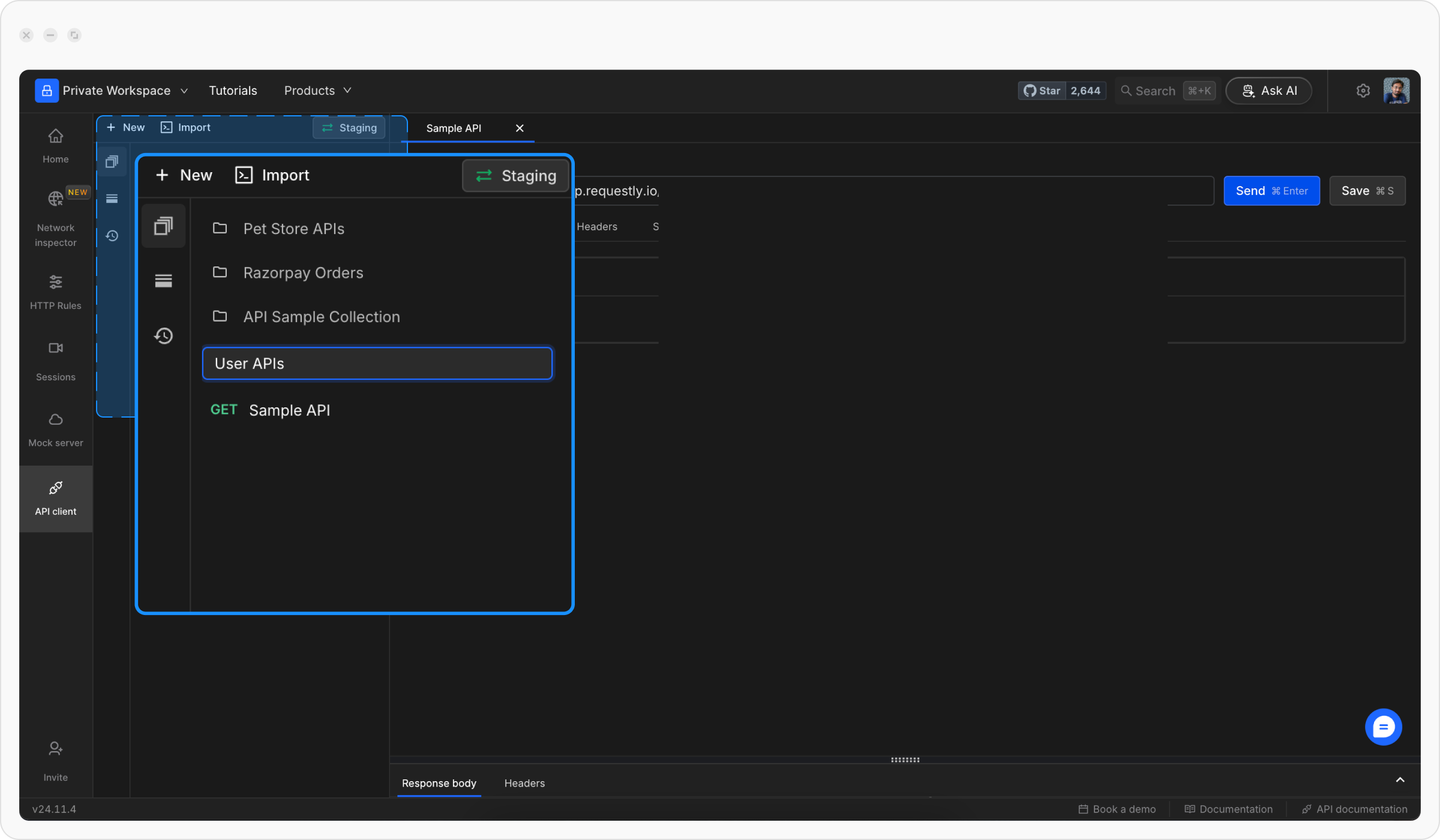 Importbutton allows you to import APIs from cURL, Requestly Collections, or Postman Collections. - Next to the Import button is the Environment Switcher, which lets you switch between environments.