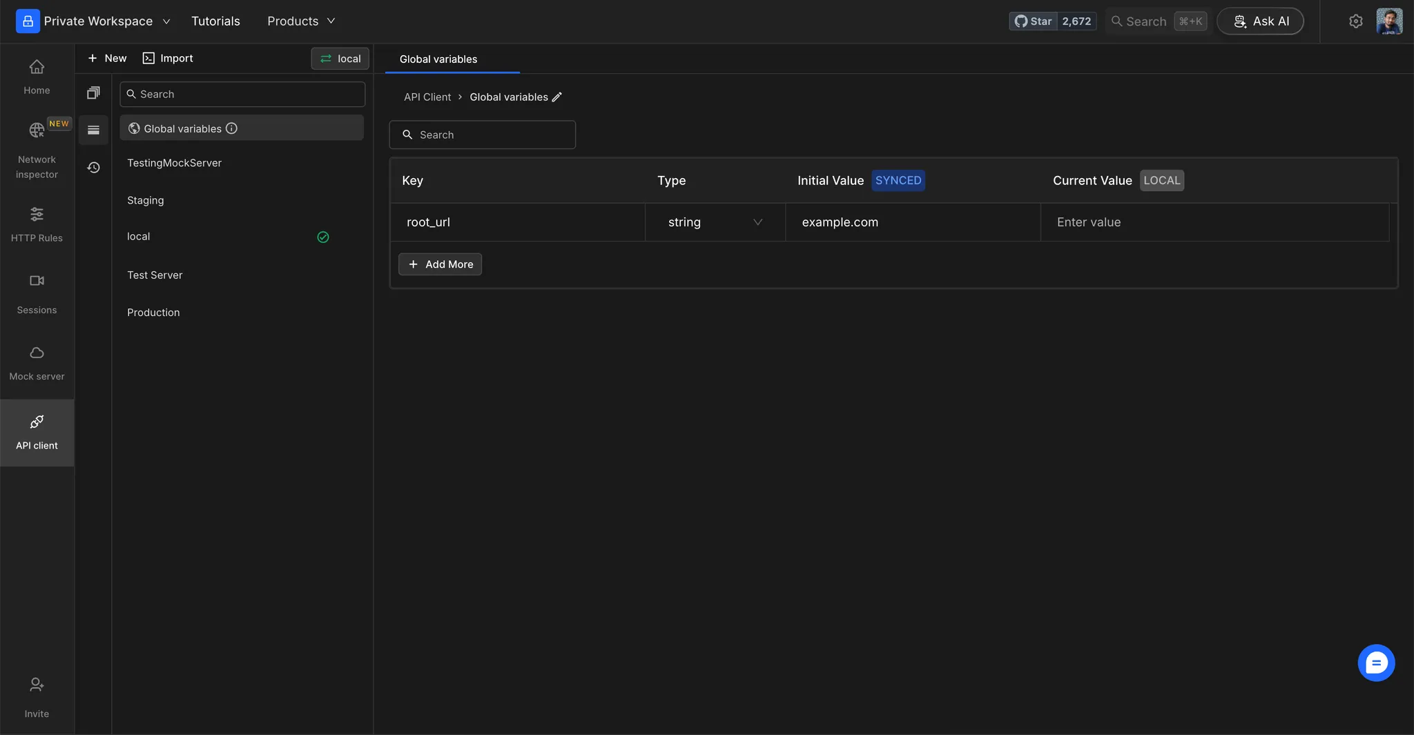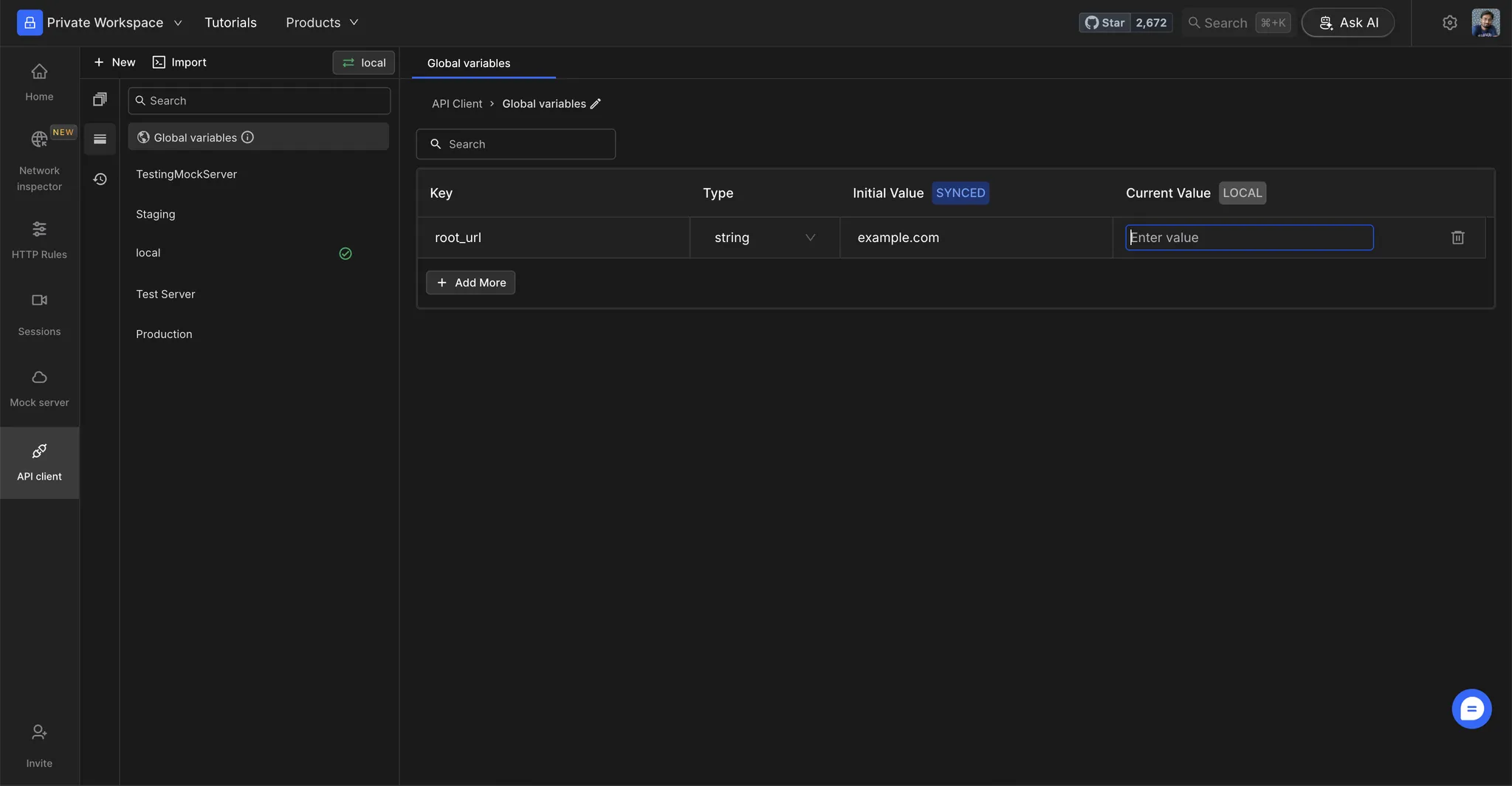 - Current value (local): Current values are user-defined entries that are not synced across the workspace. These values will override the defined Initial values. If the current value is empty or left blank, then the initial value of the variable will be used.