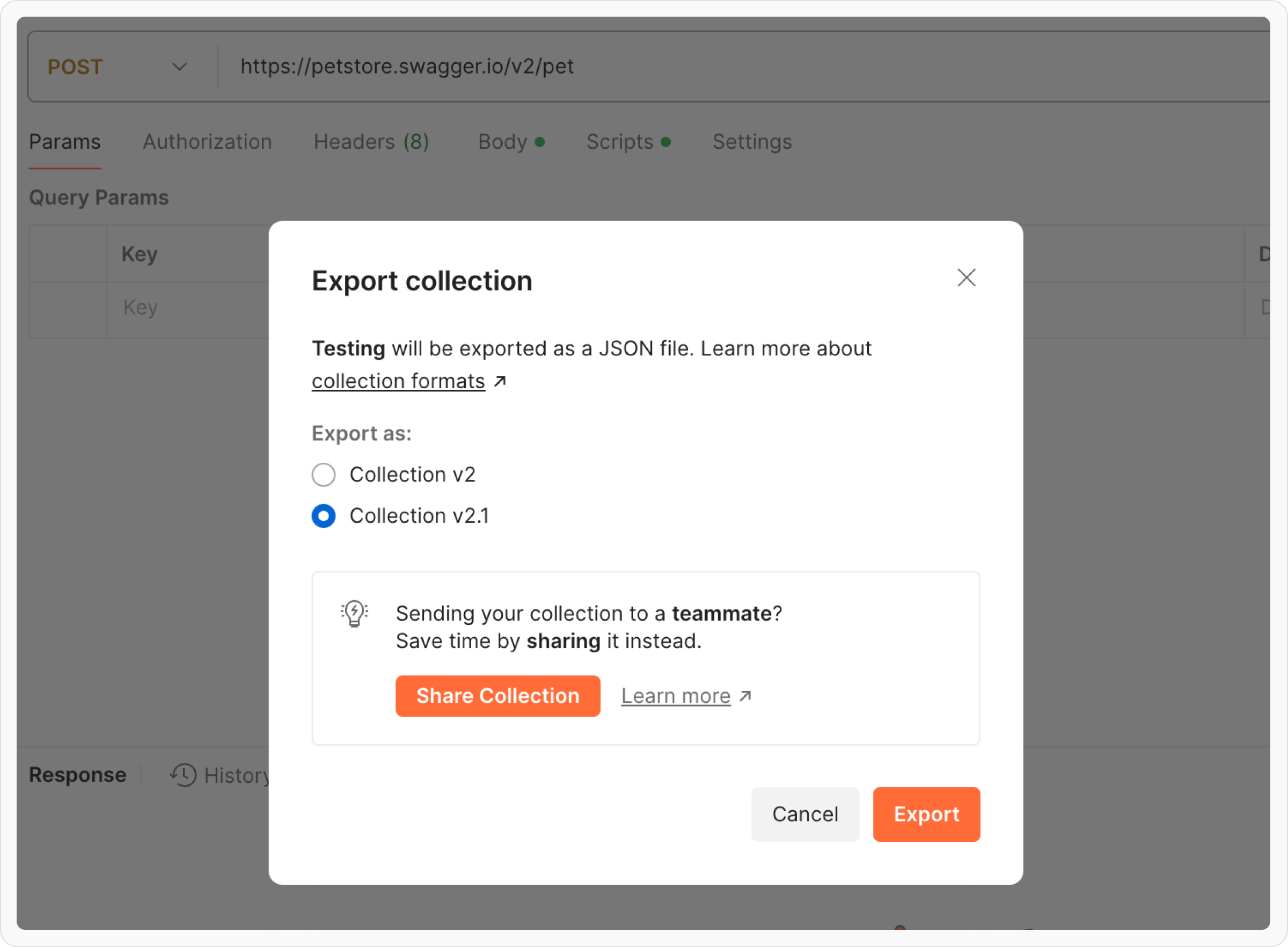 Step 1: Open Postman and navigate to the Collections tab in the left sidebar to view your collections. Step 2: Click the ellipsis (...) next to the collection you wish to export and select Export from the dropdown menu. Step 3: In the export dialog, select either Collection v2 or Collection v2.1(Requestly supports both) as the export format. Click Export and save the file. Step 4: Import using the same steps as explained in Import into Requestly section above.