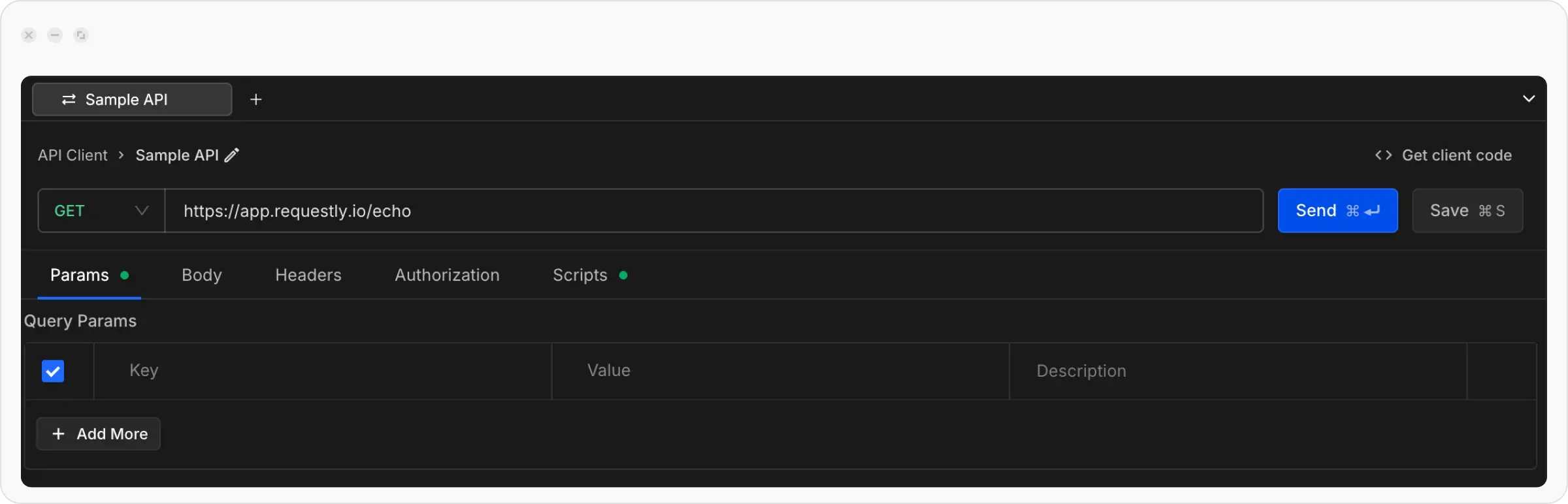 The API Client interface is divided into key sections:- Request Panel
