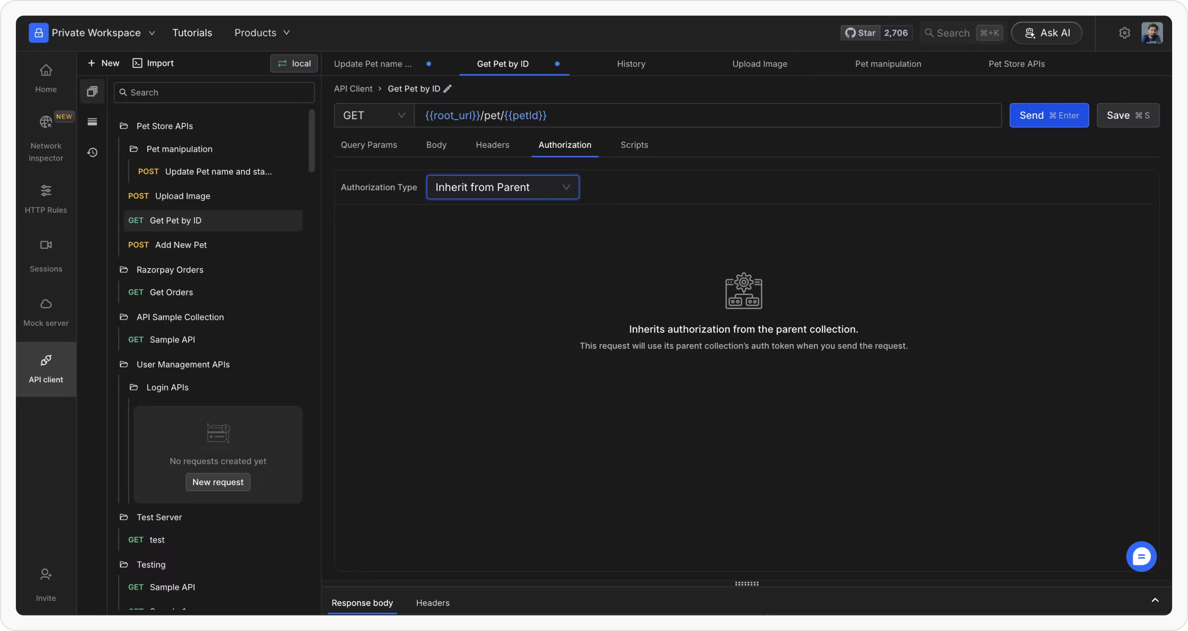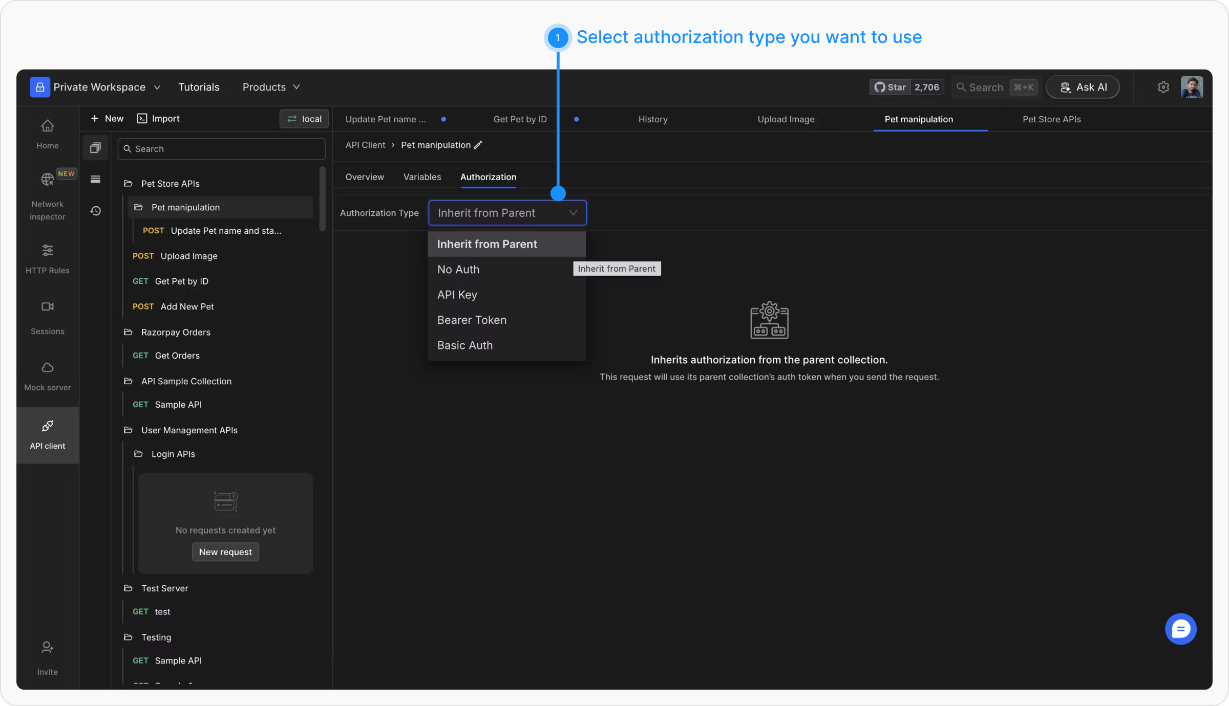 Authorization details can be configured in the Authorization tab at either the collection level or the individual request level. When authentication is set at the collection level, it applies to all APIs within that collection unless a specific request defines its own authorization settings or selects “NO-AUTH.” Requestly automatically inserts the appropriate authorization information into the necessary sections of the request based on the chosen authentication type.Steps to Add Authorization