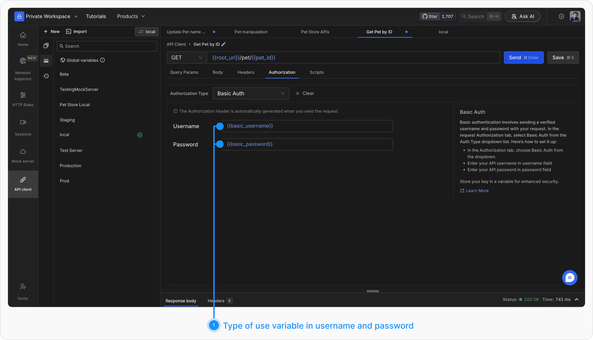 Basic authentication involves sending a verified username and password with your request. Select “Basic Auth” from the Auth Type dropdown. Enter your API username and password in the respective fields. For extra security, store these in variables.