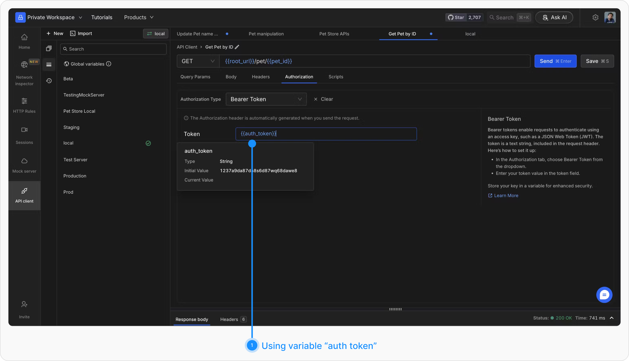 Bearer tokens enable requests to authenticate using an access key such as a JSON Web Token (JWT). Tokens are included in the request header. Select “Bearer Token” from the Auth Type dropdown and enter the token value. For additional security, store the token in a variable and reference it by name.