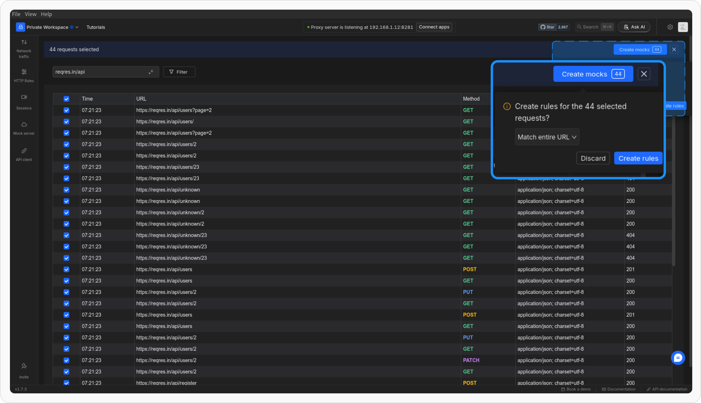 In the traffic table, choose the responses you want to create mocks for. You can select individual requests or multiple requests as needed.