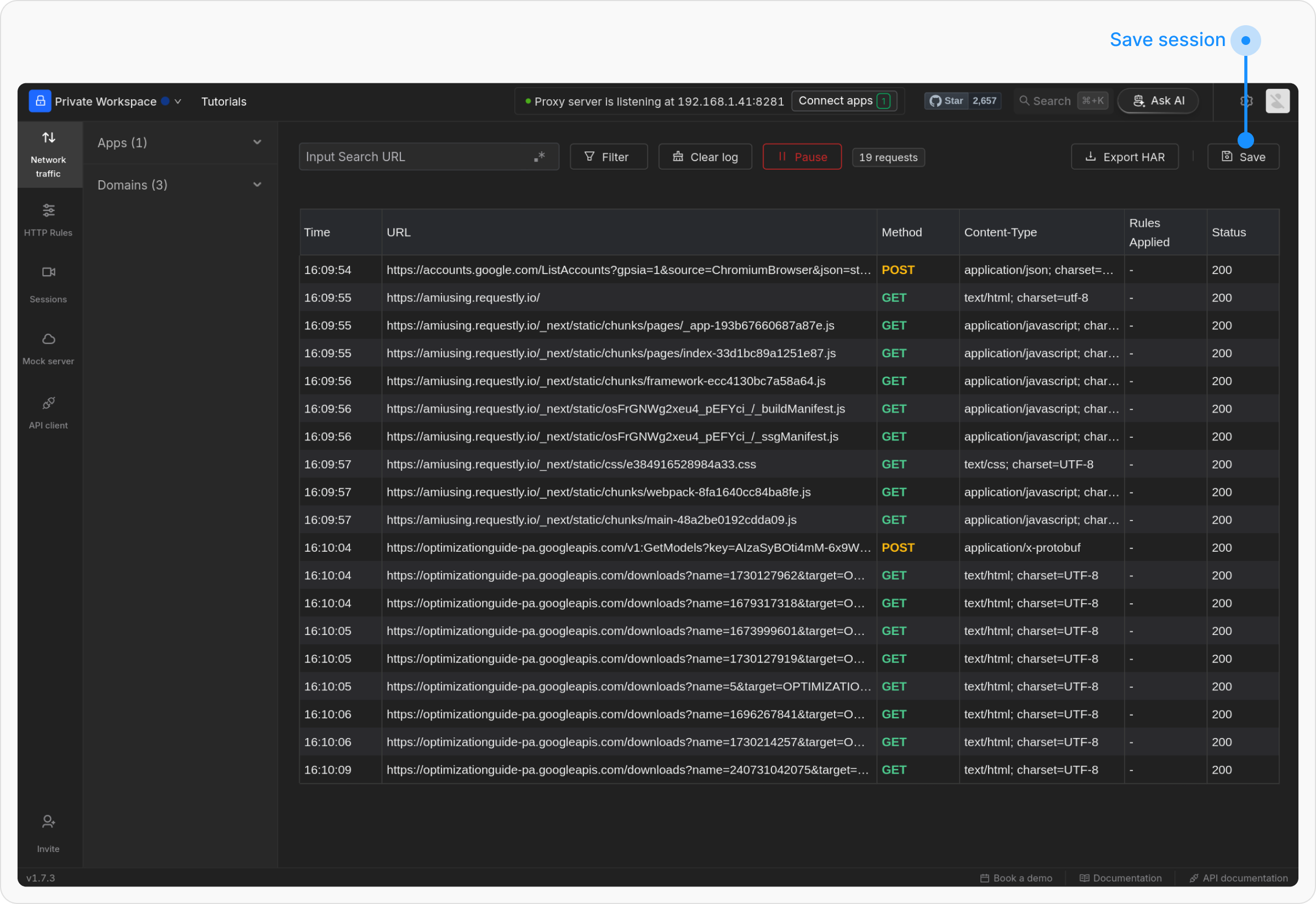 Once you’ve recorded an API session, you can easily generate bulk mock rules based on the captured requests. This is a quick way to mock multiple API endpoints without manually configuring each one.Select the Session for Mocks