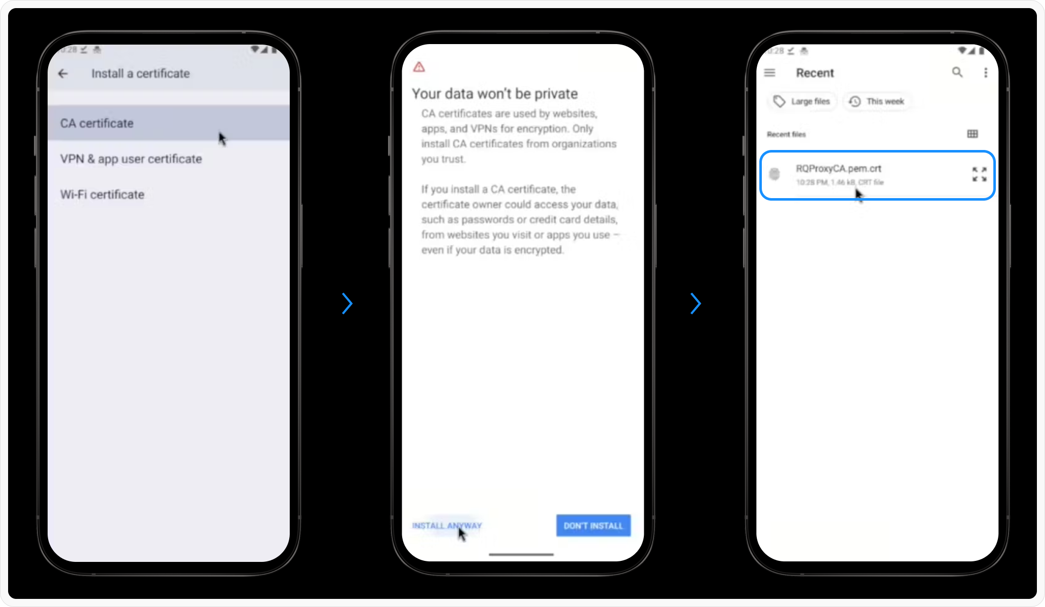 - Go to Settings > Search “CA Certificate” > Install Anyway.