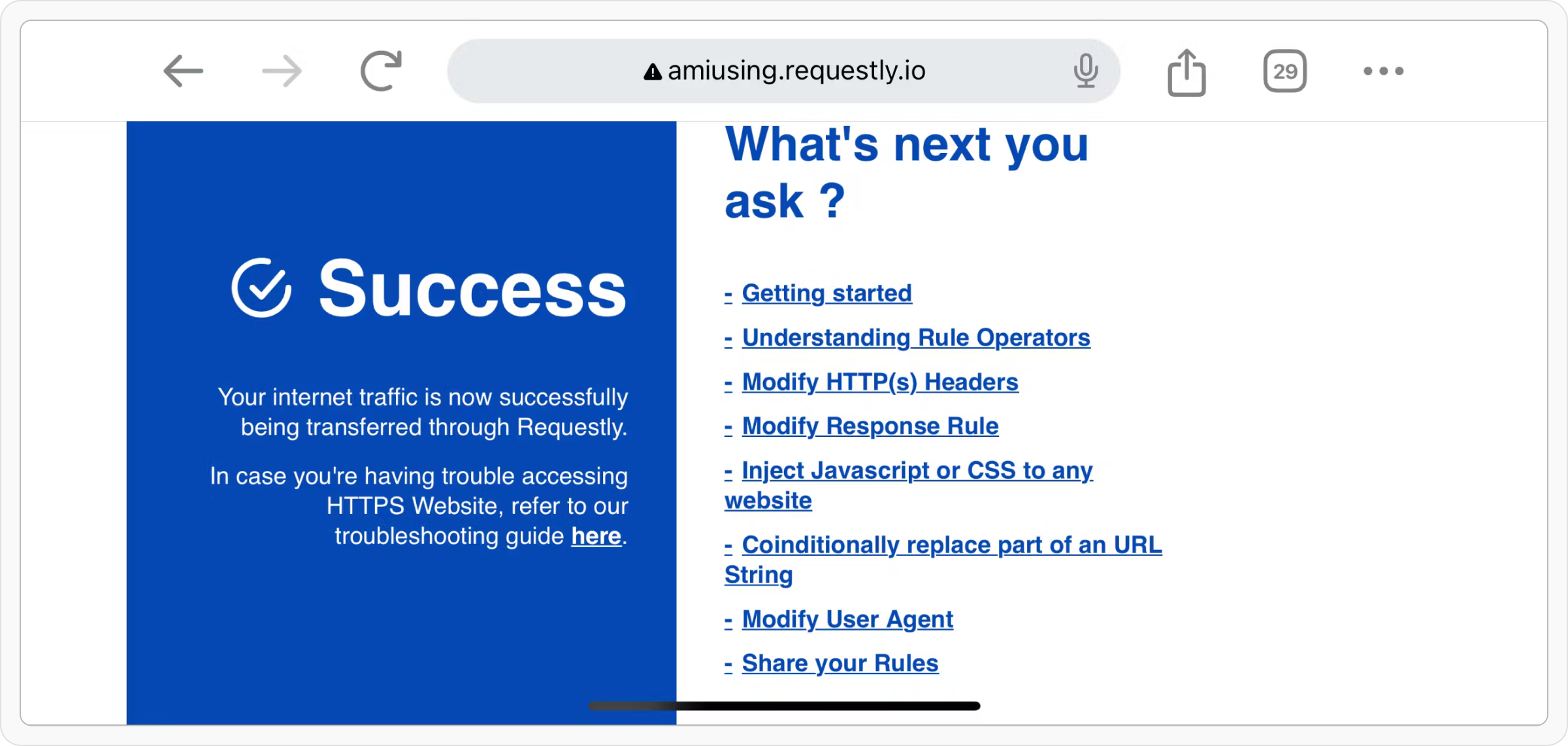 To ensure that the proxy has been set, visit http://amiusing.requestly.io(remember to use HTTP, not HTTPS) on Safari Browser of your mobile. If the rendered page shows success, the proxy is now correctly configured. You should be able to see some traffic on the Desktop app, but the body of the request/response is encrypted. To decrypt that we will have to install the CA Certificate in upcoming steps.