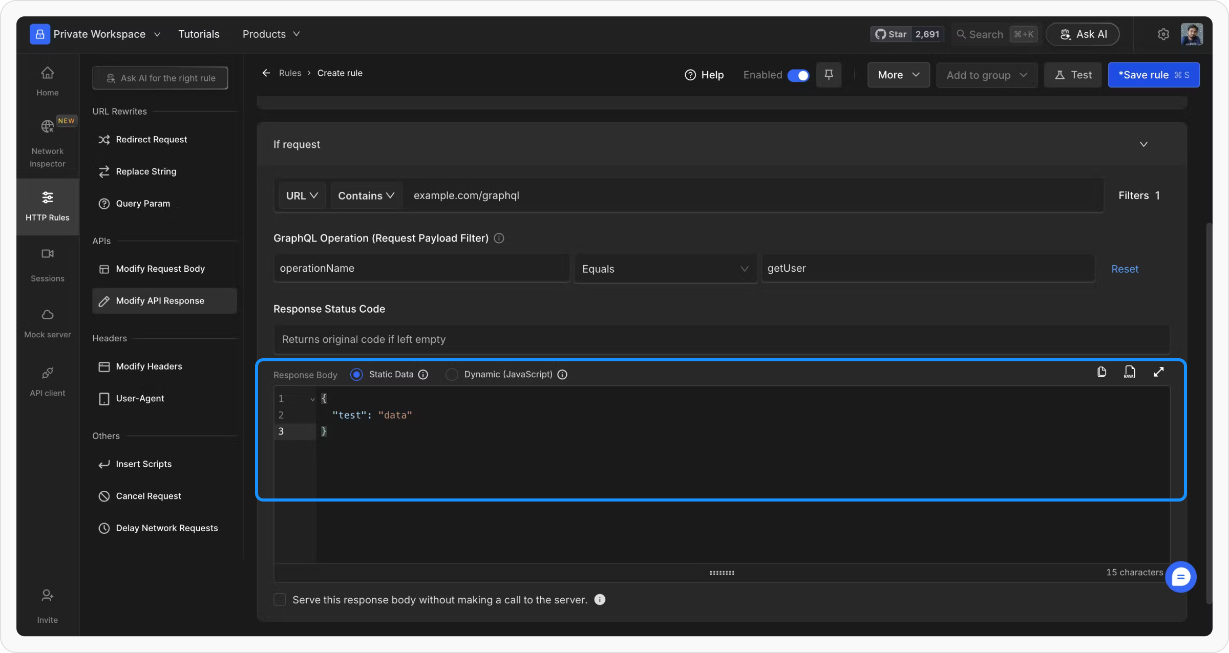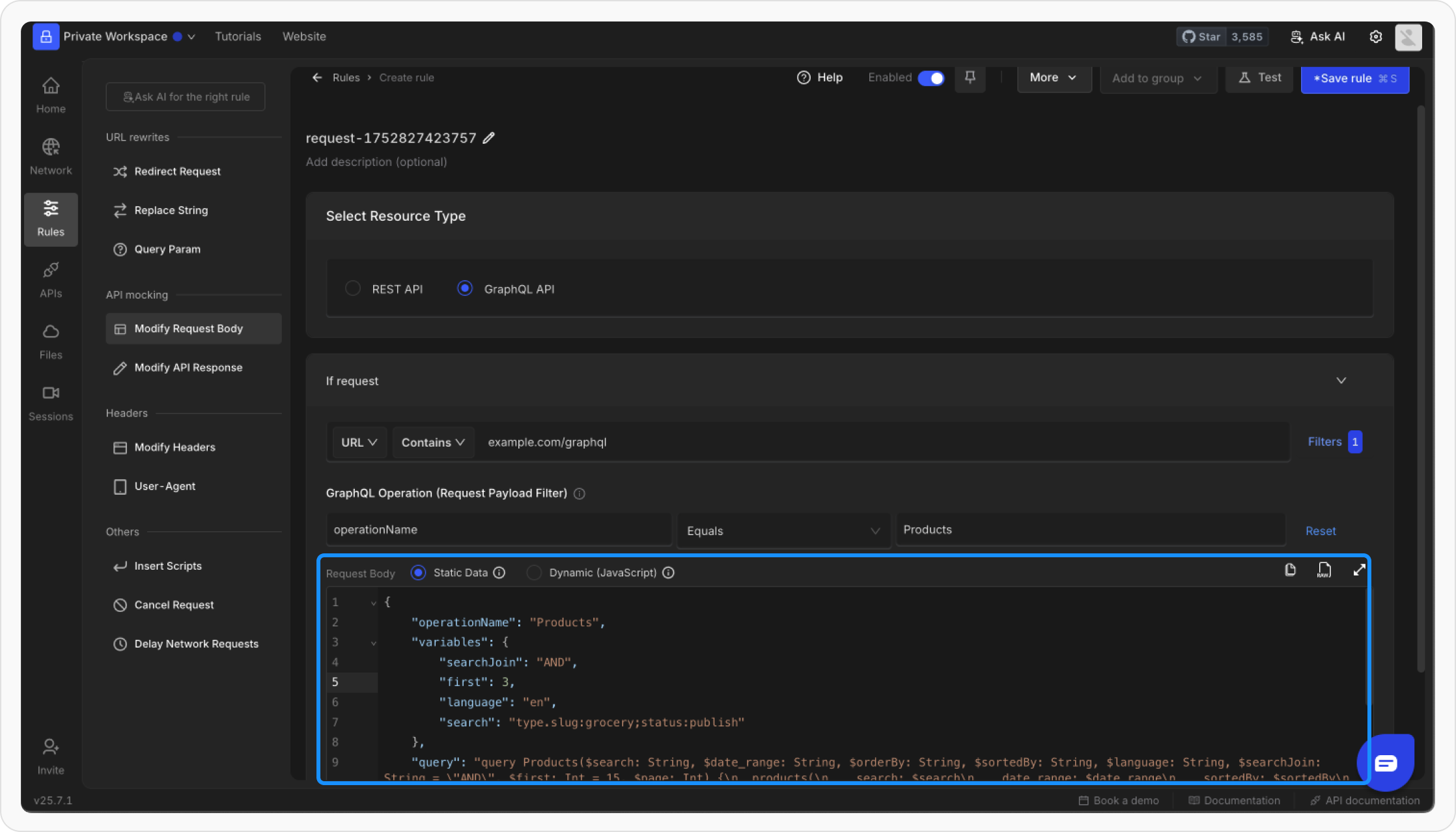 If you need to alter the GraphQL query or its variables, use the Modify Request Body rule to change the request payload dynamically.Steps to Modify Request Body