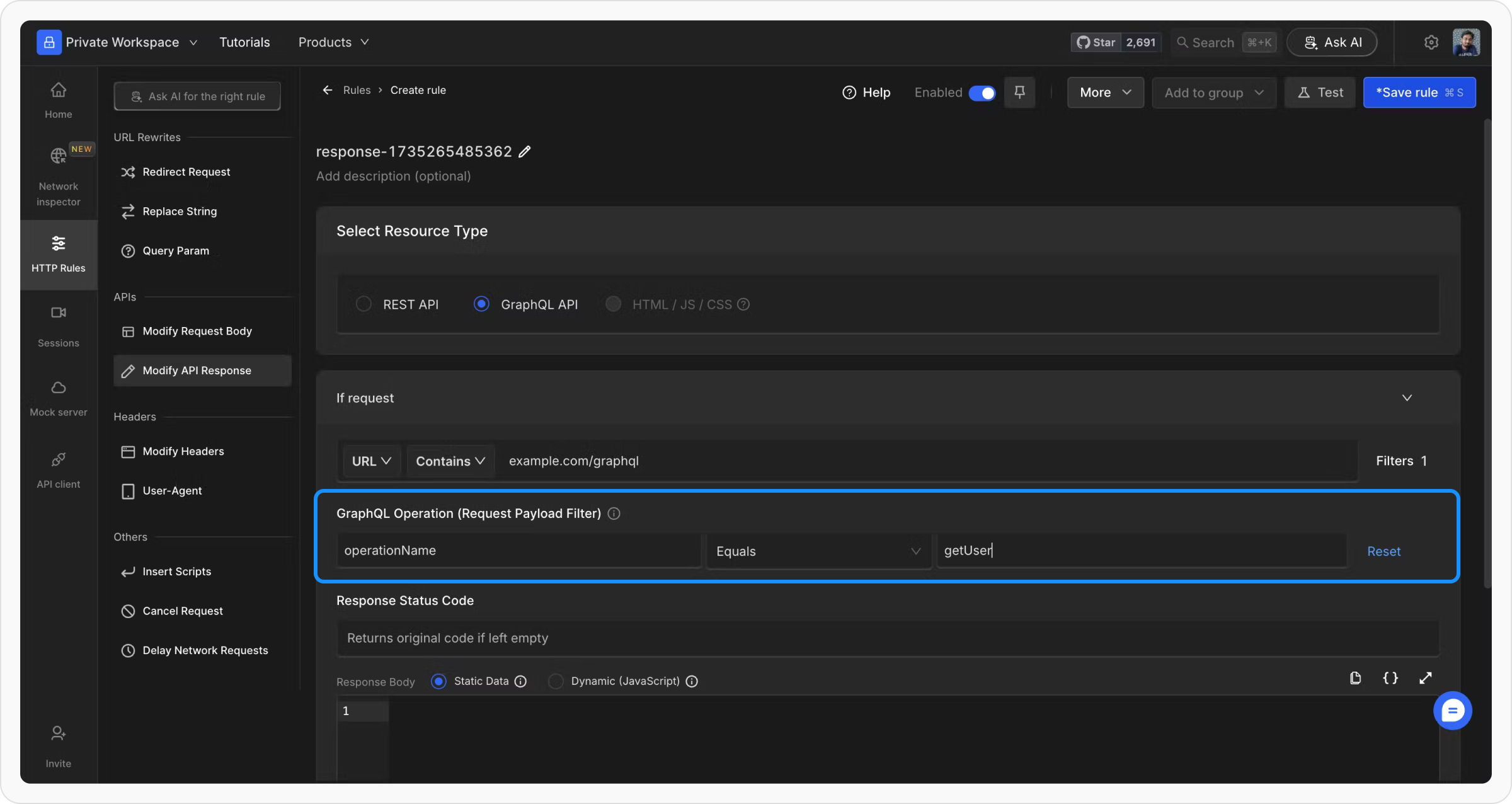 operationName, select Resource Type as “REST API” and use Dynamic (JavaScript) Mode to filter and modify the response.