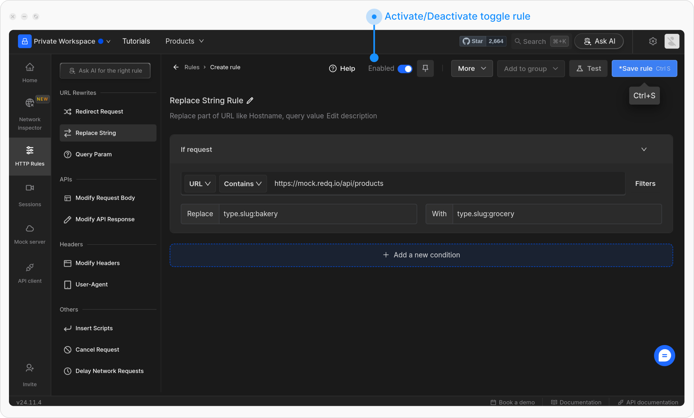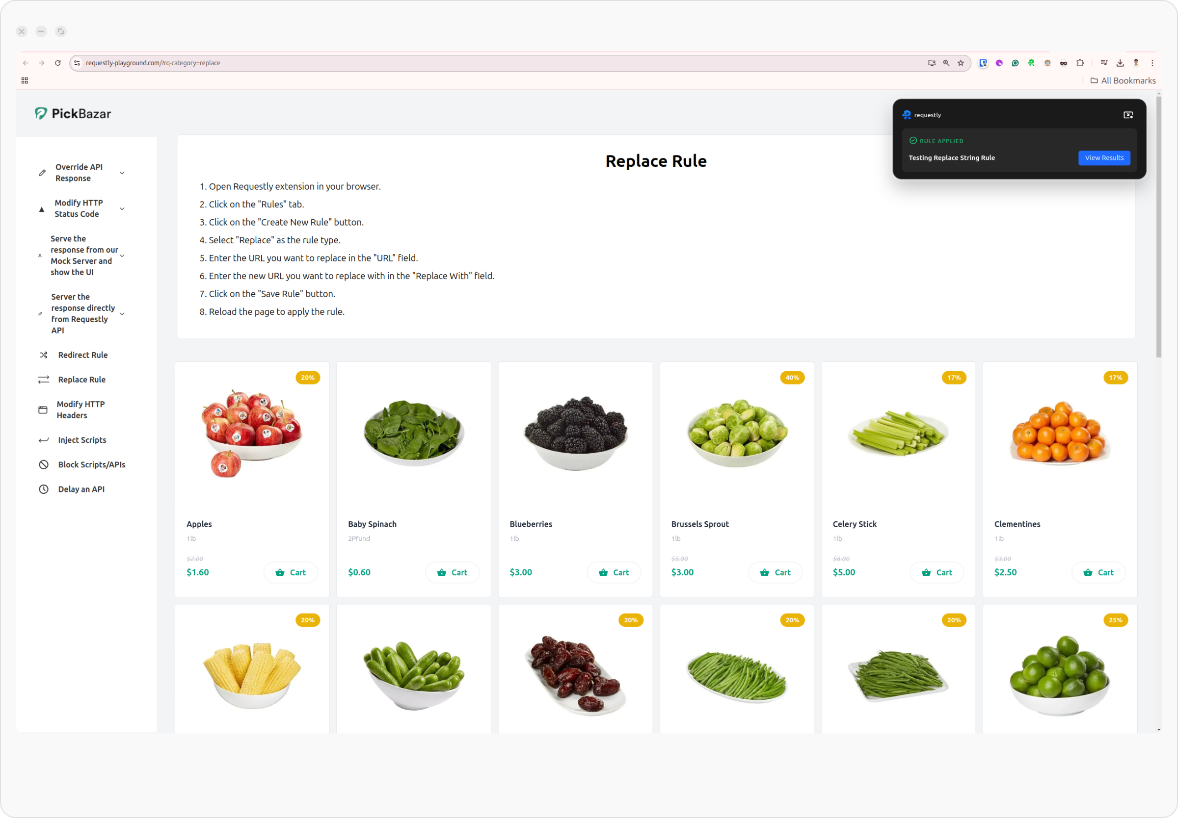 Replace Request rule. This gives you a near-live experience of how the rule works. In this case, we are targeting API requests that fetch product data.To replace the API endpoint to fetch products- Condition Type: URL