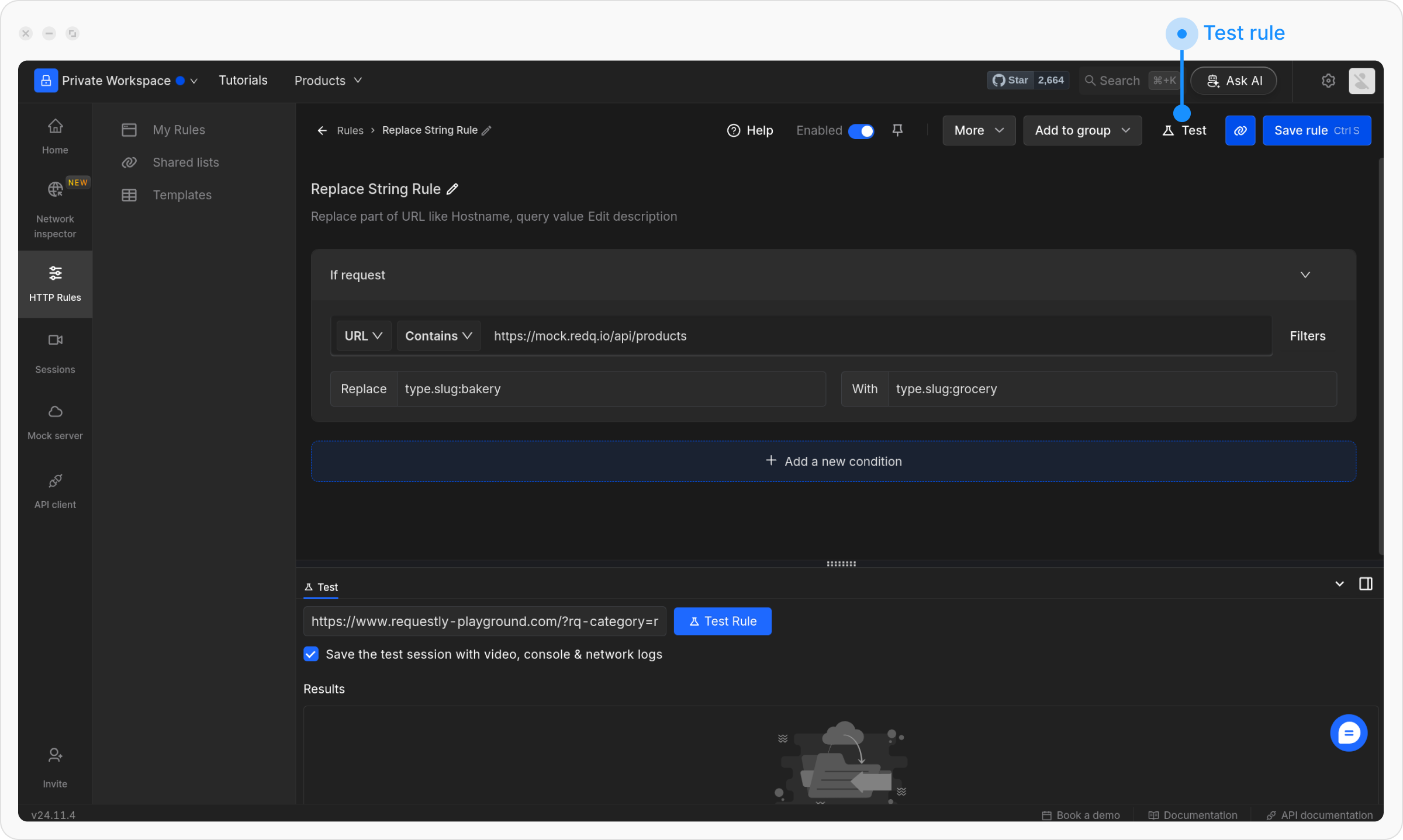 To verify the rule works as expected, click the Test button, enter a relevant URL, and then click Test Rule.You can use the following URL to test the redirection: https://www.requestly-playground.com/?rq-category=replace