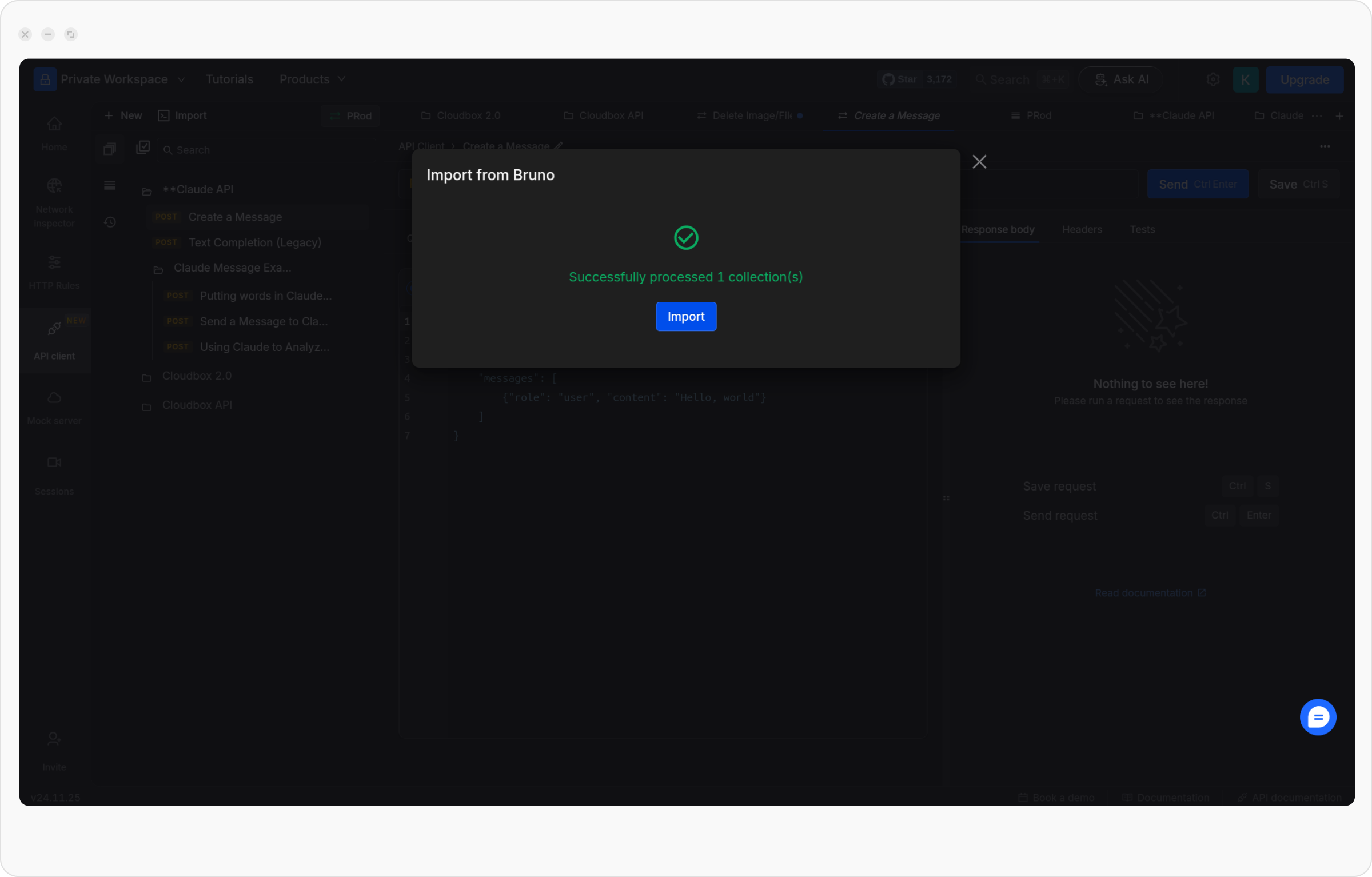 In the upload modal, select and upload each exported Bruno collection or environment file individually.