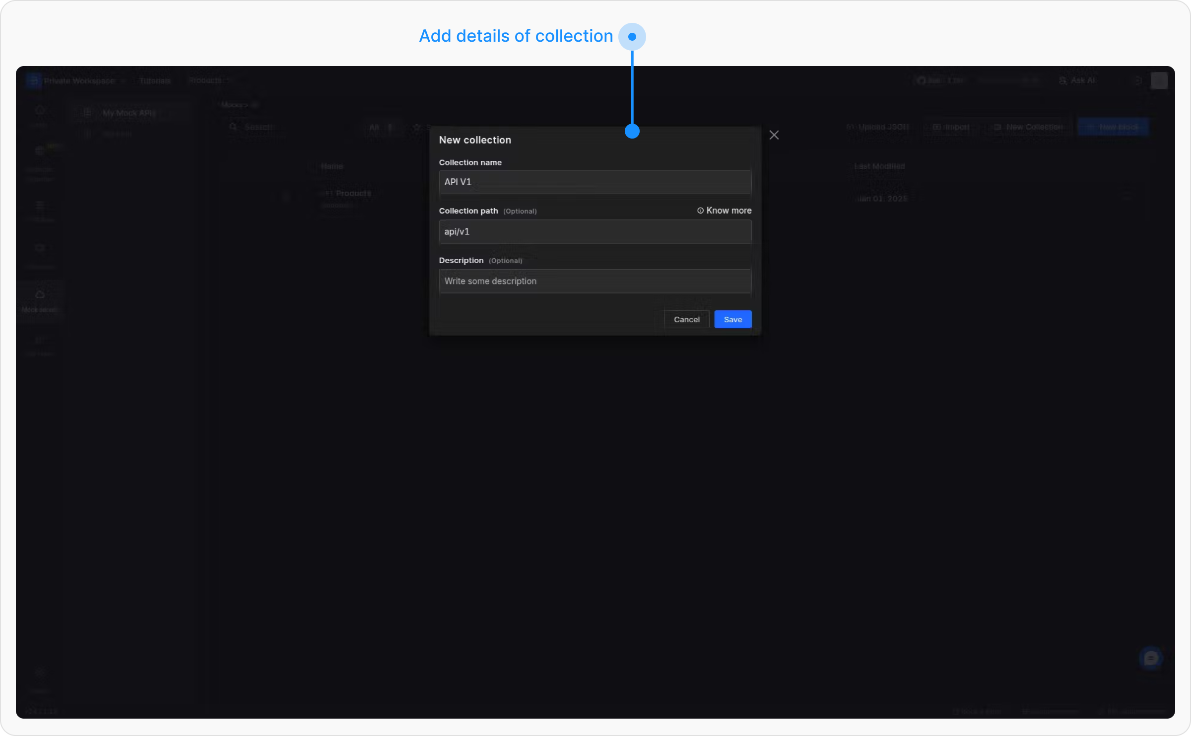 - Collection Path: A path which gets prepended to all the mocks inside this collection. For example, if the collection path is “/api/v1”, then all the child mocks’ endpoints will start with this path.