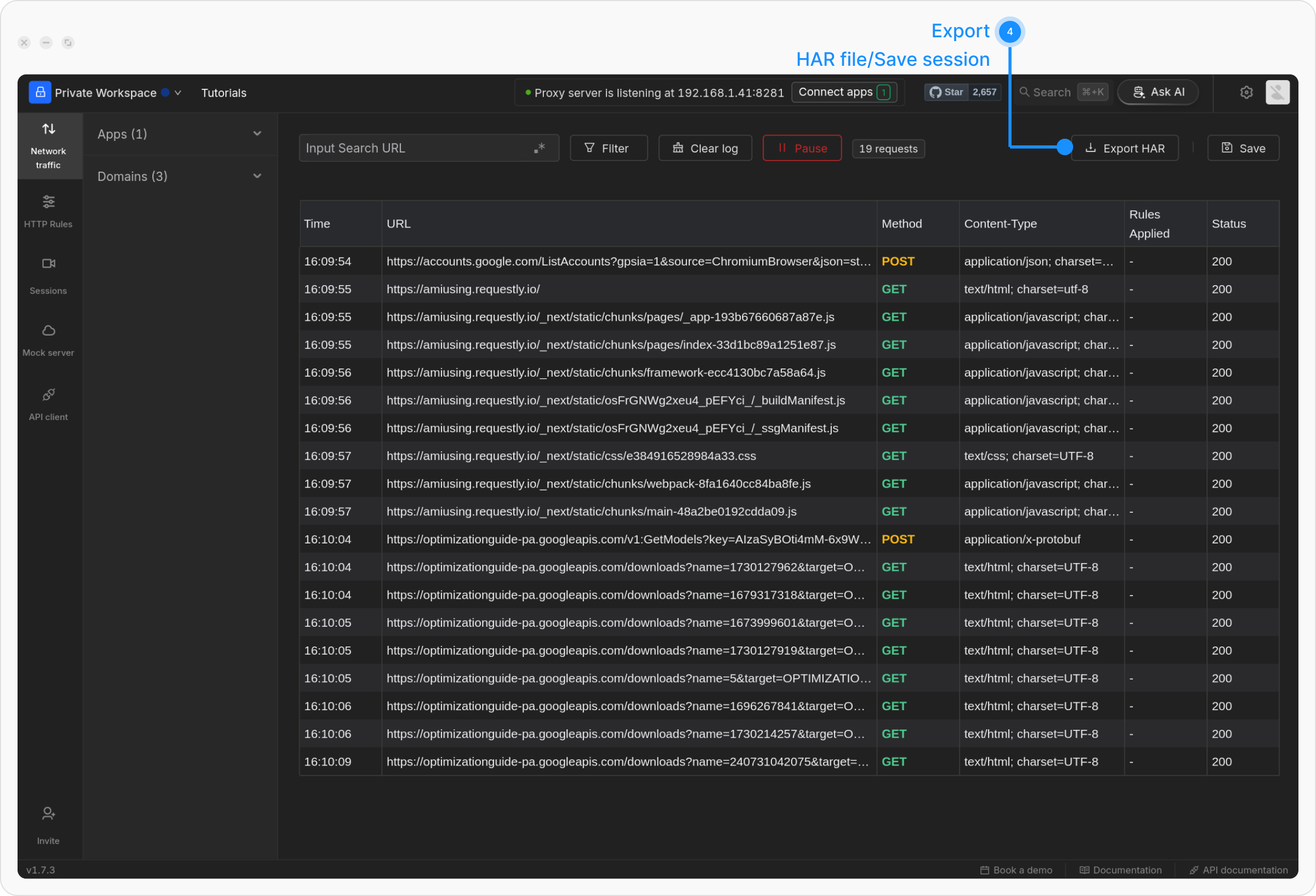 Once traffic is captured, you can either directly export the HAR file from the traffic table or save the network session and export it later from the Sessions Tab.