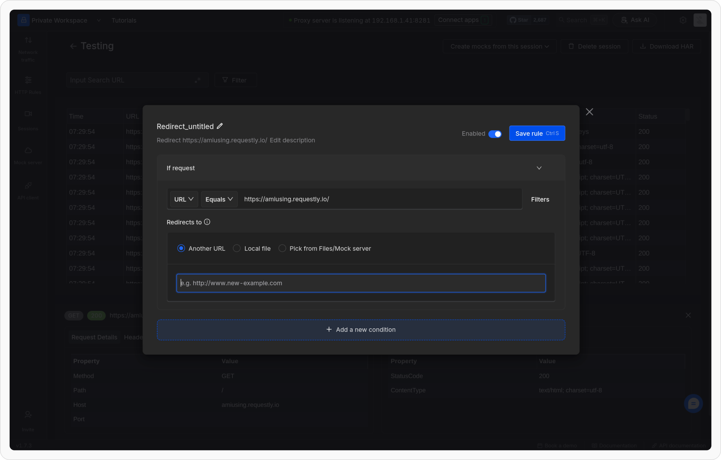 Requestly allows you to use captured sessions to create rules tailored to specific testing scenarios. This method helps replicate real-world conditions effectively. Here’s how you can leverage sessions to define rules: Popular Use Cases- Redirect Requests: Create rules to reroute specific URLs to alternative endpoints for testing purposes.