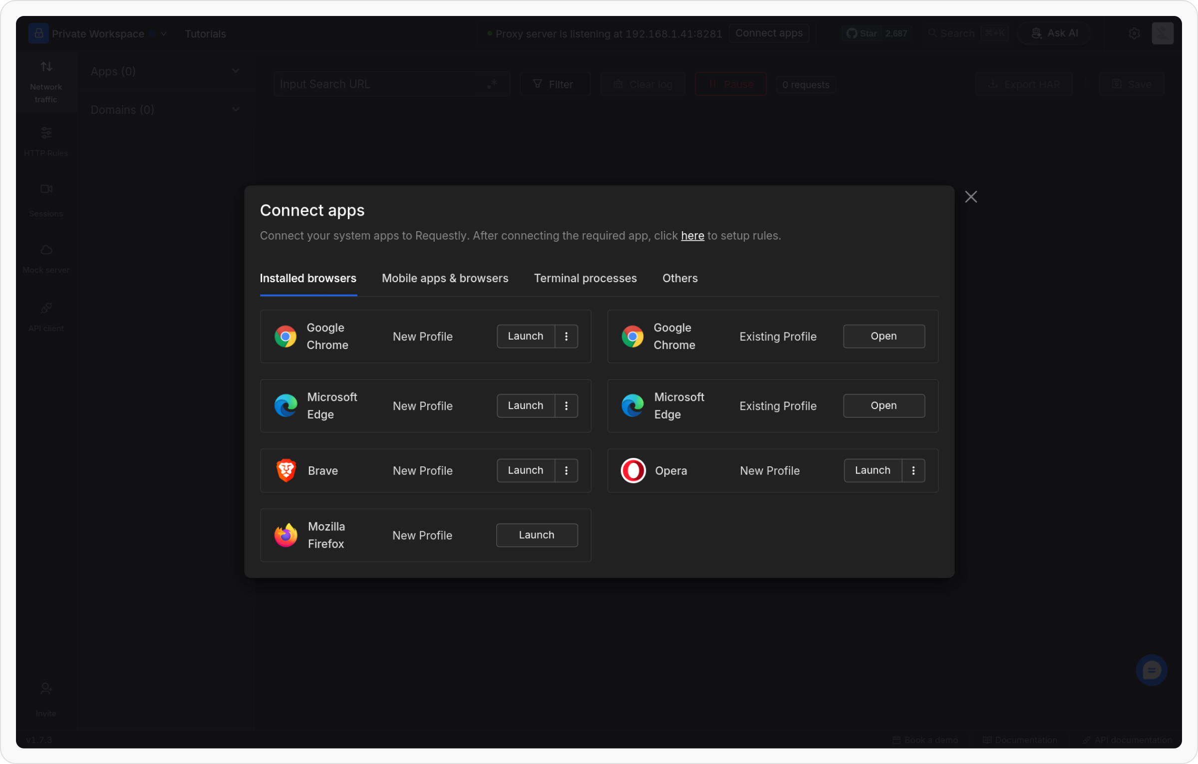 Choose from where you want to intercept traffic (e.g., browser, Android, iOS). Click Open/Launch for browser traffic and follow the instructions for mobile traffic.