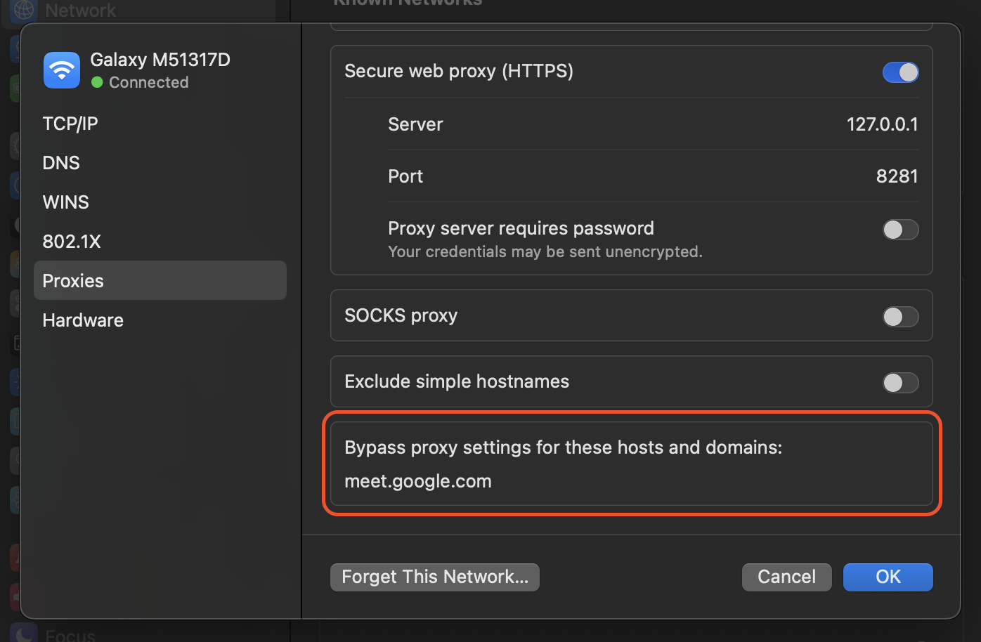 When setting the system wide proxy you can also define a bypass list. The steps for this differs based on the operating system that you use. On MacOS, OpenSettings and navigate to the details of the Wifi that you are connected to.