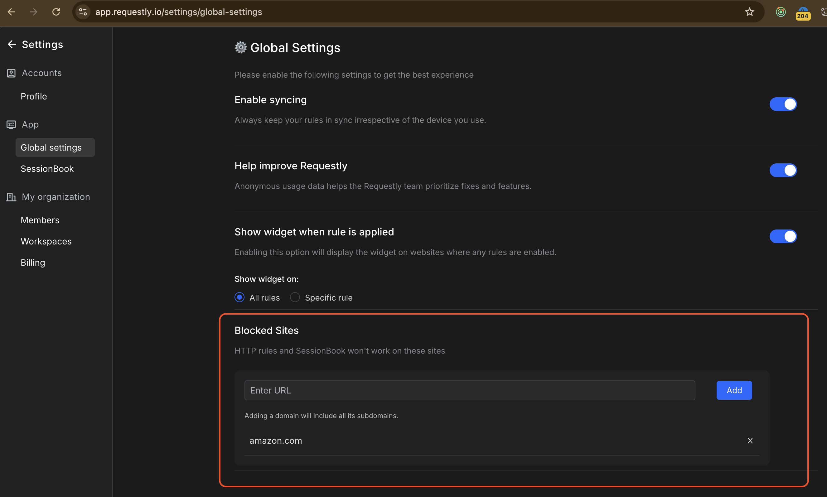 You can already define a blocklist - domains that remain unaffected by the Requestly extension inside the global settings of the webapp