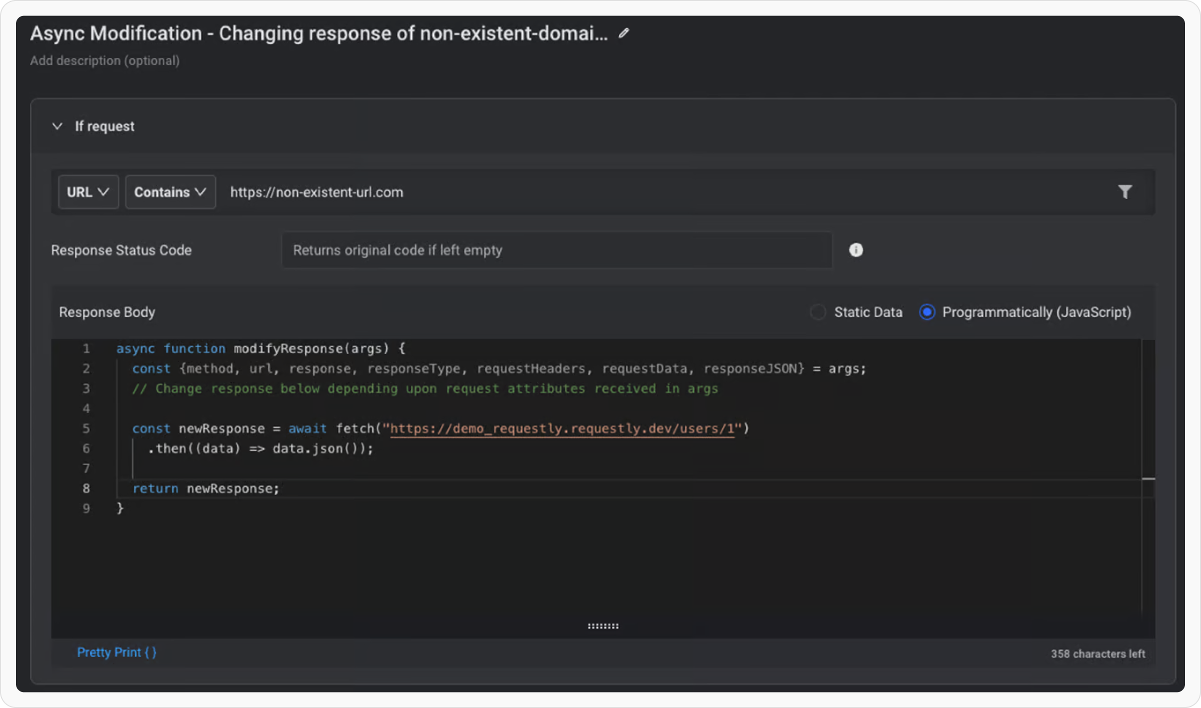 This example changes the response of a non-existent domain (https://non-existent-url.com) by fetching the response from another url (https://demo_requestly.requestly.dev/users/1)Rule: https://app.requestly.io/rules#sharedList/1677766334864-Async-Modification-Changing-response-of-non-existent-domain-programmatically