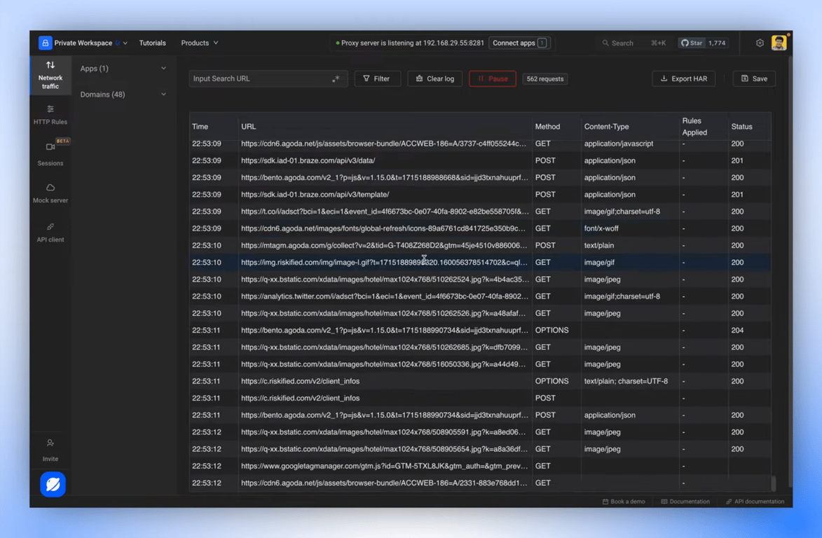 Capture Network Traffic: Perform actions in your app to generate network traffic. Monitor and review this traffic within Requestly.