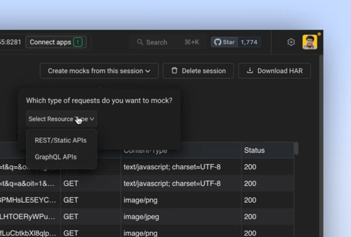 Create Mocks from the Session: Click on ‘Create Mocks from this Session’ button. Then, select the type of APIs you want to mock.