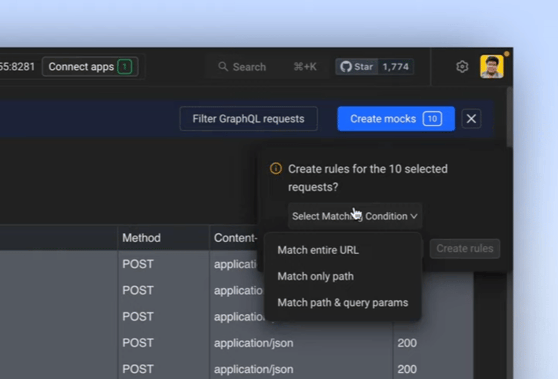 - Specify Matching Conditions to Create Rules: Define the rules for mocking by choosing matching conditions such as matching the entire URL, only the path, or both path and query parameters. Review the created rules in the rules index.