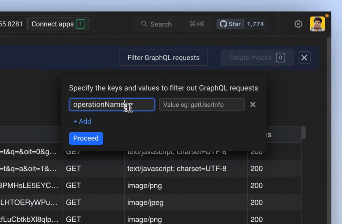 For GraphQL APIs: Apply a Payload Filter to find specific requests containing the desired key. Then, filter and select the requests you wish to mock.
